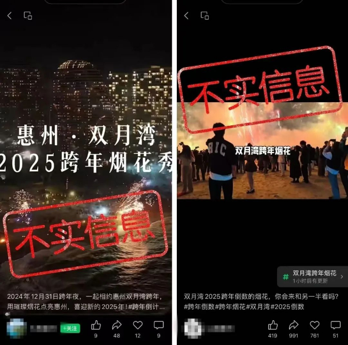 经核实,目前广东省惠州市惠东双月湾没有举办2025年跨年烟花秀活动的安排,网传“惠州双月湾2025跨年烟花秀”或称“惠州双月湾跨年海岸线均可燃放烟花”、“2025年惠州双月湾跨年烟火(花)秀(表演)”等相关信息均系不实信息。